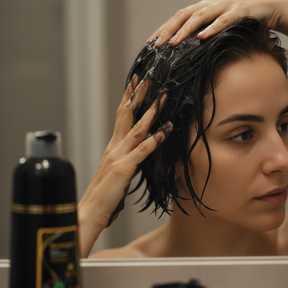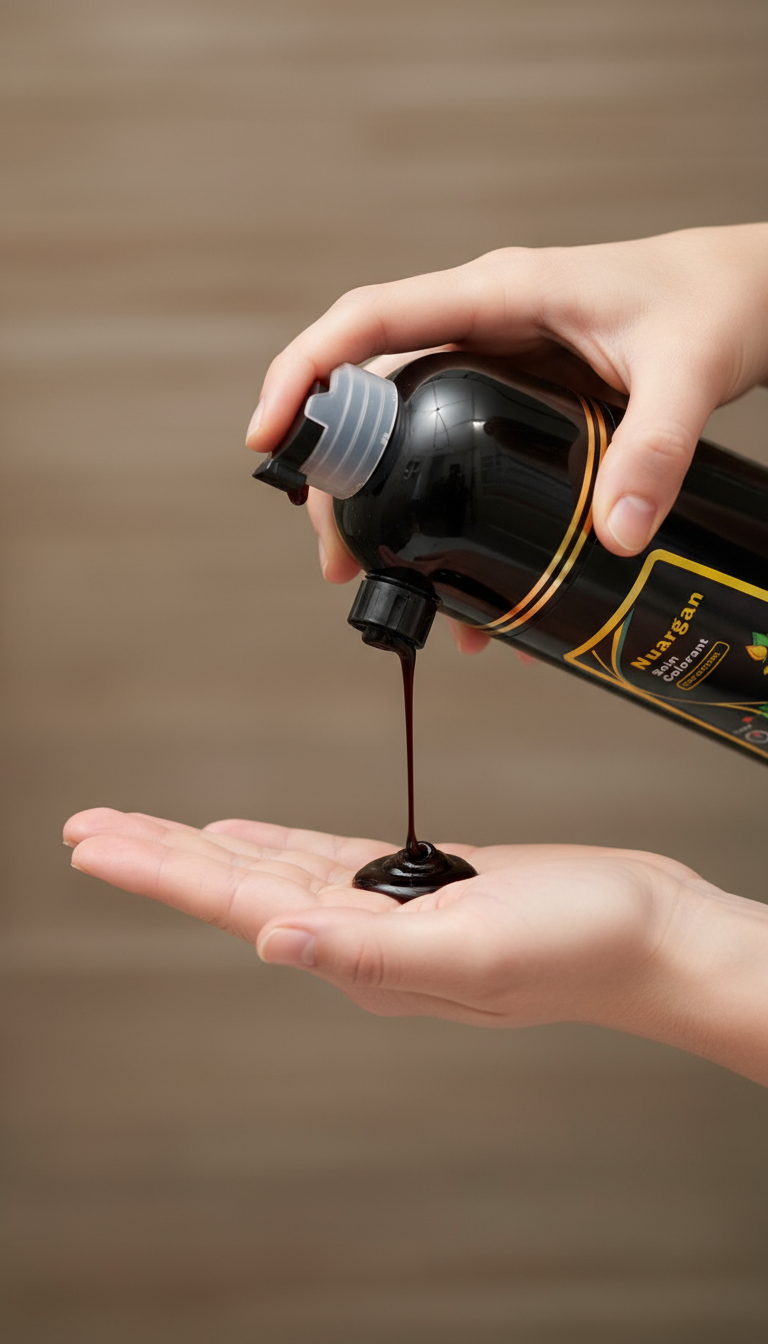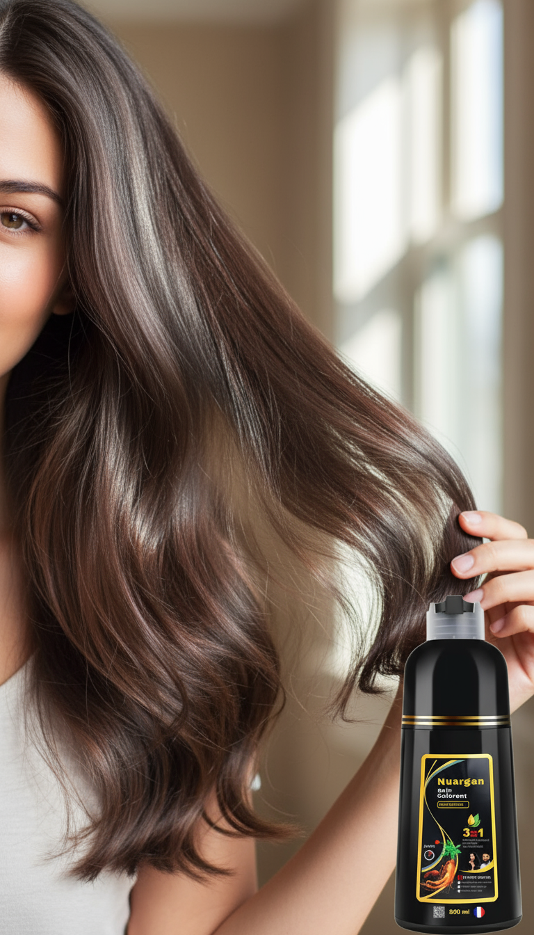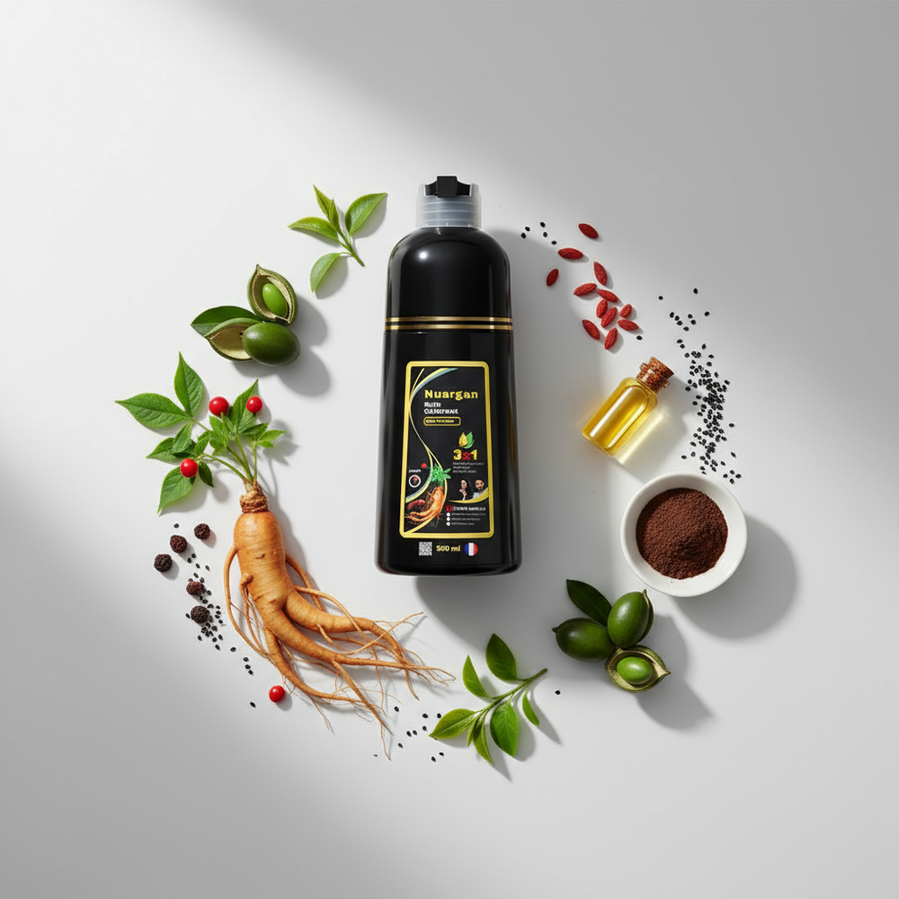L’huile de sésame noir et l’extrait de gingembre stimulent le cuir chevelu, fortifient les racines et favorisent une pigmentation riche et durable.